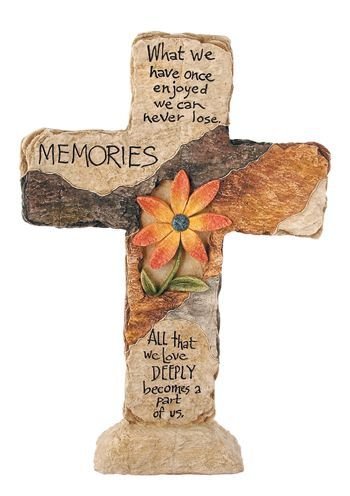 This pedestal cross measures 11" high by 7 1/2" wide. It is made from cast resin. Message reads: Memories -- What we have once enjoyed we can never lose. All that we love deeply becomes a part of us. Read more...
